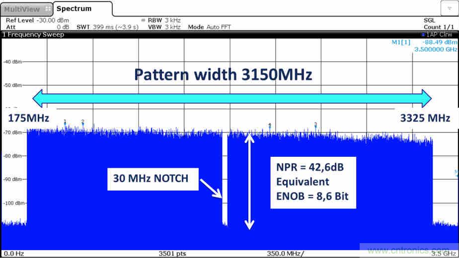 這款器件的寬帶NPR如下圖(圖9)所示。7Gsps的采樣率帶來(lái)3.150GHz的合成帶寬。NPR是42.6dB,等效的有效位數(shù)(ENOB)為8.6。注意NPR的平坦度一直到3325MHz的位置都相當(dāng)好。