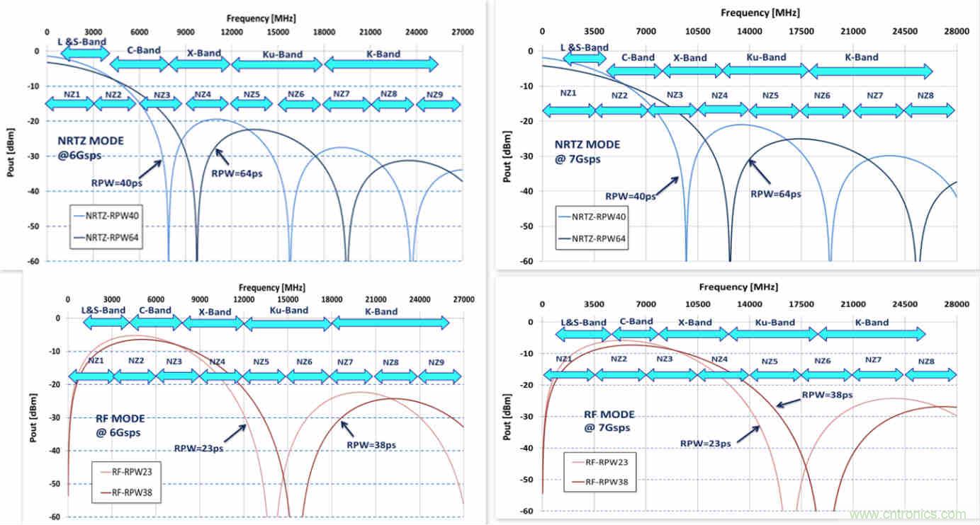 特性曲線(圖6)表明脈沖整形帶來(lái)的優(yōu)勢(shì)。這些數(shù)據(jù)展示了兩種RPW設(shè)置(如果您對(duì)信號(hào)偏置不了解,請(qǐng)閱讀這里)時(shí)橫跨8個(gè)奈奎斯特區(qū)間的高達(dá)27GHz (采樣率fs = 6 & 7Gsps)的頻譜。注意采樣率的提高顯著地?cái)U(kuò)展了典型的SINC (sin(x)/x) DAC 輸出特性曲線。