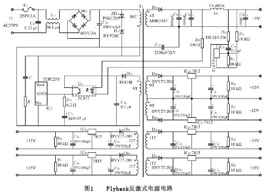 輸入為交流220V,經(jīng)功率二極管整流橋變?yōu)橹绷髯鳛榉醇ぷ儞Q器的輸入,輸出為三組直流:+5V,15V,12V,另外有一輔助電源5V,用來給光耦PC817供電。控制電路用反饋控制,選用TOPSwicth系列的TOP223Y芯片。