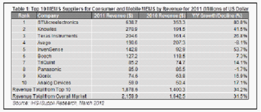 據IHS iSuppli公司的MEMS市場追蹤報告,2011年10大供應商占消費與移動MEMS器件市場總體營業收入的86%,蘋果公司的主要供應商意法半導體在該領域遙遙領先。