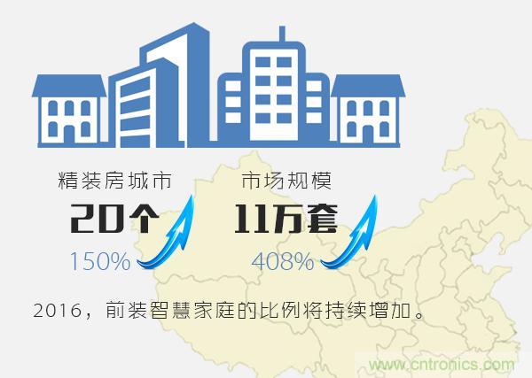 2015年各大地產(chǎn)商和物業(yè)公司都在推出智慧家庭和智慧社區(qū)的產(chǎn)品或樣板,包括花樣年、招商地產(chǎn)、金地物業(yè)、保利地產(chǎn)、萬(wàn)科等。據(jù)奧維數(shù)據(jù)顯示,2015年有智能精裝房的城市達(dá)到20個(gè),同比增長(zhǎng)150%;市場(chǎng)規(guī)模達(dá)到11萬(wàn)套,同比增長(zhǎng)408%。2016年面對(duì)低迷的樓市,為了維持房?jī)r(jià),商品房中前裝智慧家庭的比例還會(huì)增加。