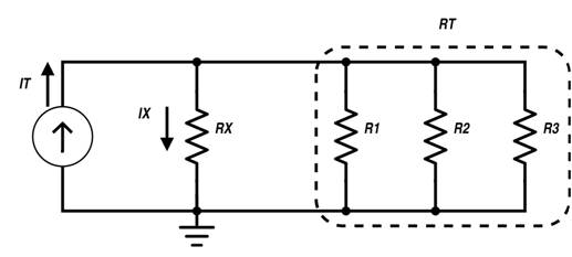要了解其工作原理,請參閱下圖。I T是提供給四個并聯電阻電路的總電流。I X是流經 R X的電流。如下式所示,流過 R X的 I T的分數將等于 I X乘以 R X與總電阻之比。如果所有電阻器的值都相同,則通過每個電阻器的電流將相同。