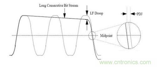 我們知道,在串行信號中串個AC耦合電容,這個電容可以提供直流偏壓和過電流保護,但也會給鏈路帶了另一個問題PDJ(pattern-dependent jitter)。顧名思義,這和碼型有關。我們的鏈路可以等效成高通RC電路,當出現連續的“1”或“0”時,會出現下圖的直流壓降,這不僅會影響眼高,還會造成PDJ。
