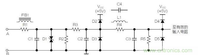 圖5:原理圖,防止ESD、EMI、EMS和RFI等有害的電氣現象的原理圖。