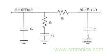 一般而言,壓控振蕩器均使用現成的器件,在挑選器件時注意性能指標的匹配就可以,只有環路濾波器才是需要計算和設計的。環路濾波器在整個電路中主要作為一個低通濾波器,它將芯片鑒相器輸出的脈沖信號進行低通濾波,將高頻分量濾除,最終得到一個相對平滑的直流電壓信號去控制VCO工作,從而獲得一個穩定的頻率輸出。環路濾波器的性能將直接影響到小數分頻頻率合成器芯片性能的測試。