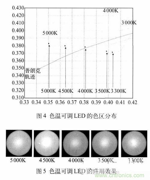 集成封裝的LED,由于工作電流較大,工作時產生大量的熱量,積聚在pn結內部的熱如不及時傳導出去,將導致器件溫度升高,溫度對LED的性能產生重要的影響,如色溫變化、波長紅移、正向壓降等。圖5所示為色溫可調LED的應用效果,將封裝好的色溫可調LED模塊安裝到100mm筒燈上,紅光LED加上不同的電流,得到筒燈的發光效果。筒燈連續點亮30min后,測試筒燈上散熱器溫度為38℃,鋁基覆銅板上的溫度為38.5℃(室溫25.2℃),說明色溫可調LED具有良好的散熱性能。