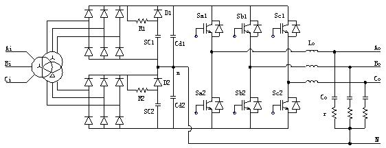 圖中,SC為超級(jí)電容(SuperCapacitor),R為SC充電電阻,D為SC放電二極管,Cd為直流平波電容器,Sa~Sc為IGBT器件,L0及C0為輸出濾波器的電感和電容。交流輸入側(cè)采用Y/Y/D接線的三繞組輸入變壓器及兩組三相不控整流電路構(gòu)成12脈波整流系統(tǒng),注入系統(tǒng)的諧波電流次數(shù)為12k±1,數(shù)值高,因此在無特殊要求場(chǎng)合,不用考慮設(shè)置濾波電路。